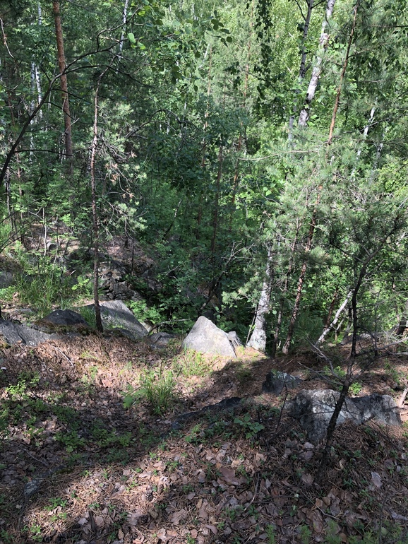 Нашли чудесное место - стол, мангал, костровище, скамейки. Жгли костер, жарили сосиски. перекусили на свежем воздухе. Немного погуляли по лесу, поползали по скалам и довольные поехали домой.