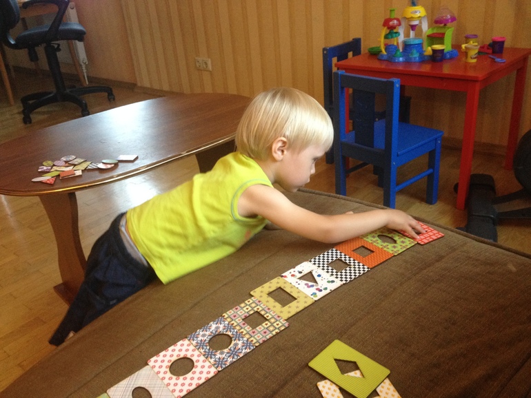 Развивается внимание и изучаются геометрические фигуры. Как Оказалось Андрей не знает ромб (теперь знает) и путает овал и круг (теперь не путает).