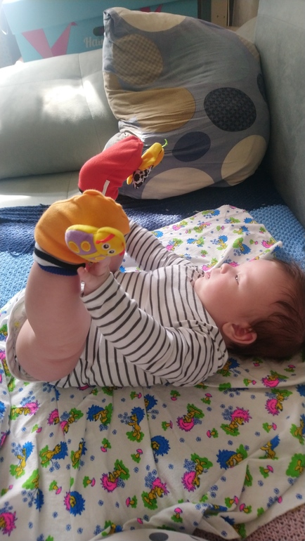 Вообще к игрушкам холоден, может взять ненадолго, лизнуть и кинуть тут же. Больше нравится жевать всевозможные тряпочки, в том числе пеленку или собственную кофту 🤗