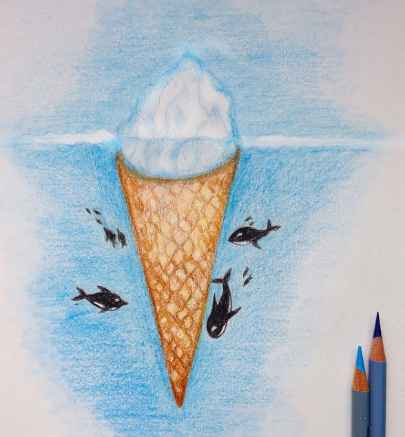 Рисунок нашла случайно, нужна была идея для зарисовки. Его автор испанский художник Начо Диас, он рисует в стиле компьютерная графика. А мне так понравился этот айсберг в виде вафельного рожка, что я решила повторить его в карандаше.
