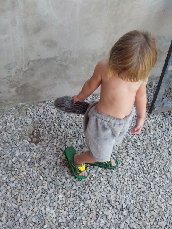 3.Нашла костюм волка, бегает с хвостом))).Лето. А шлепки Толины))