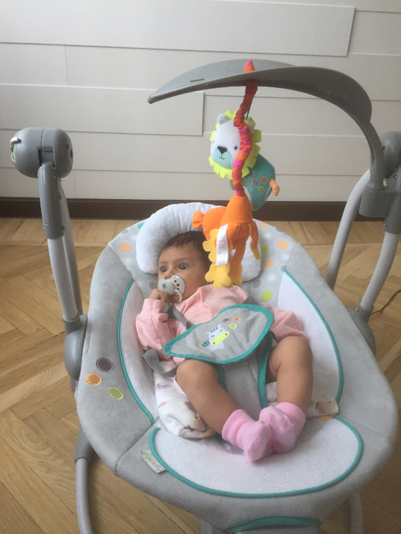 - наконец-то нам нравятся электронные качельки (теперь мама спокойно может готовить ужин на кухне, взяв их с собой)