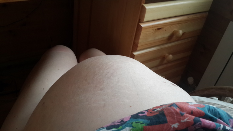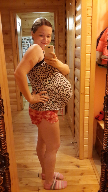 Живот некрасивый. В прошлых растяжках, которые снова потемнели... Размеры, конечно, не те что раньше))) Сначала активно рос, как и с двумя, а потом притормозился. Конечно, разница очевидна. И теперь я уверена - там ОДИН)))