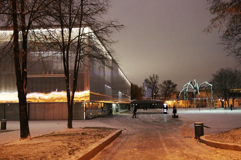 Мне понравилось новое просторное помещение GARAGE. Идеальное место для масштабных выставок. Сейчас (до 7 февраля) тут проходит выставка "Луиз Буржуа. Структура бытия: клетки". Представлены ее скульптуры и инсталляции, которые она создала в последние годы жизни. На площади (перед музеем) GARAGE представил монументальную скульптуру паука Maman, 1999.