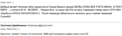 я уже не ждала это выкупа, и через 8 месяцев мне приходит сообщение что нужно оплатить платье и 100% , то которое я в августа заказывала и уже прям с расчетом