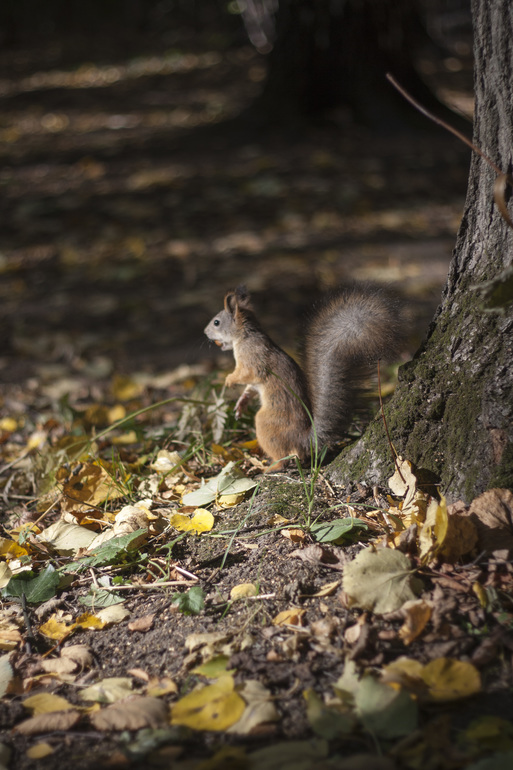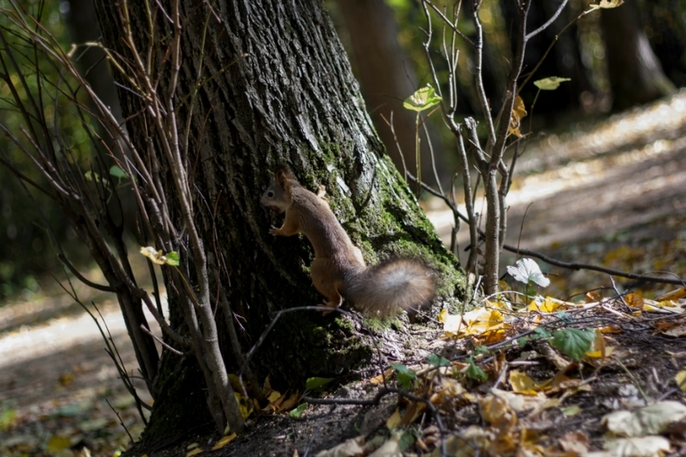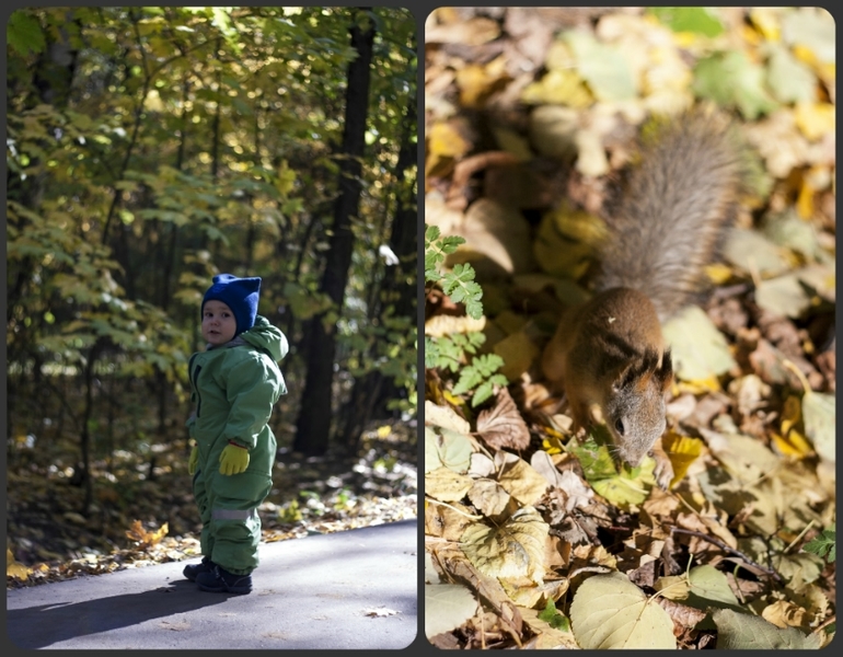 Левушка с 0 до 1,5 летВ Кусково очень много белок и осенью они как никогда коммуникабельны, ведь нужно делать запасы орехов на зиму. Встречают нас на входе в парк, и преследуют попятам.