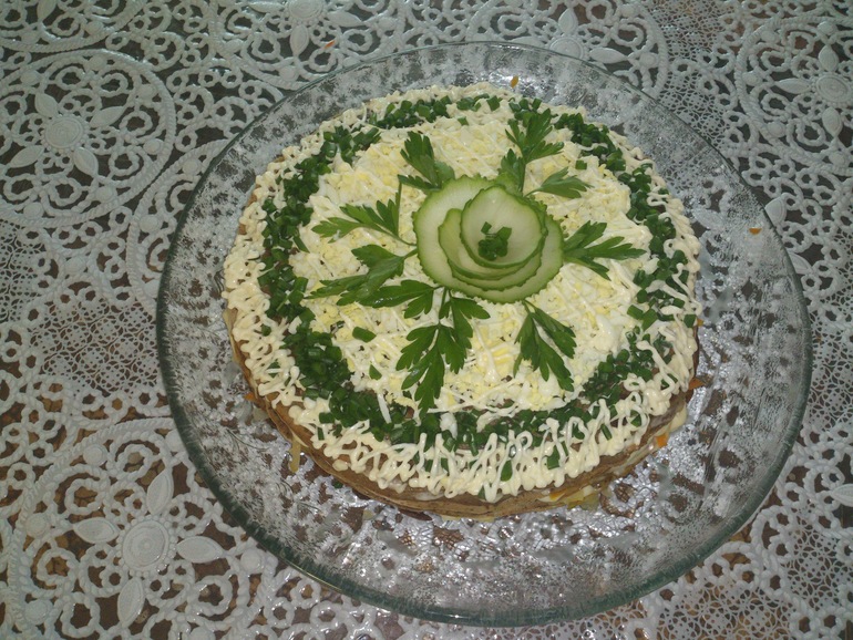 2-3 луковицы измельчить, 2-3 морковки на крупную терку, обжарить. Я сделала это раньше блинов. И по мере выпекания блинчиков прослаивала их.
