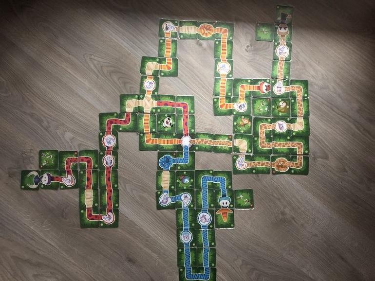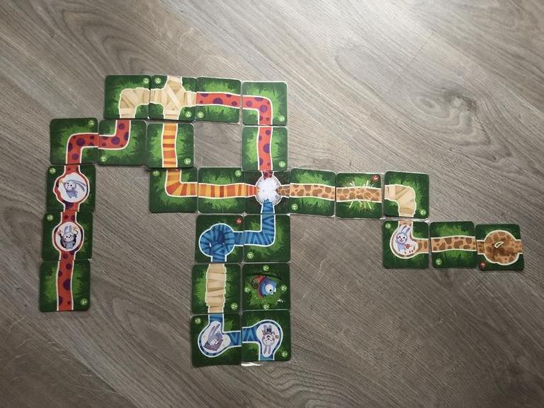 Первым начинает тот, кто раздавал карты, далее по часовой стрелке. Игрок обязан выложить одну карту с рук на игровое поле. Это может быть как участок с цветом вашего питона, так и с цветом питона другого игрока. Выгоднее конечно выкладывать соперникам участки с колючками или с узлами, т.к. в конце игры они отнимают очки. Хотя бы с этим пунктом мои дети свыклись, т.к. часто бывает, что других карт, которые можно выложить, на руках нет. Можно также заворачивать хвосты чужих питонов, врезая их в другие, блокируя тем самым на какое-то время их рост. Но мы это не практикуем. Уж очень обижаются. После того, как игрок выложил карту, он берет новую из колоды. Если игрок не может ничего выложить (на руках только карты, которые играются в конце: москиты, головы, шляпы), то он берет одну карту из колоды и пропускает ход.