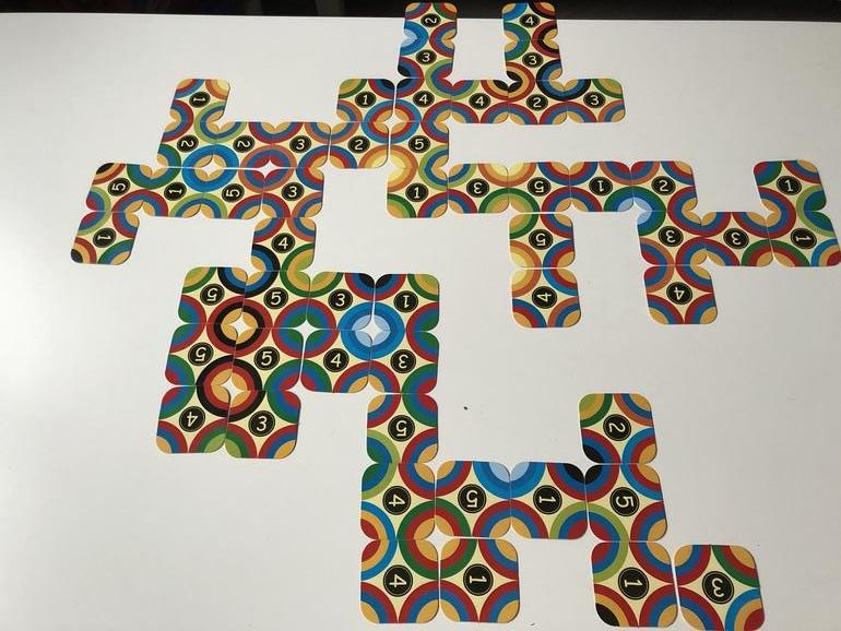 По правилам каждому раздается по 5 карт, начинает младший игрок, затем по часовой стрелке. Если в свой ход выложить нечего, то ход пропускается, выкладывает карточку следующий игрок и добирает карты до 5-ти. В начале игры у нас был ступор, т.к. ни у кого подходящих карточек не оказалось. Пришлось брать из стопки по очереди, хотя в правилах этот момент никак не прописан. Нужно быть очень внимательным, чтобы не пропустить возможность присоединения узоров, но сначала от насыщенных цветов глаза разбегаются.