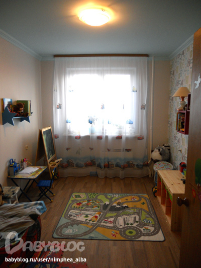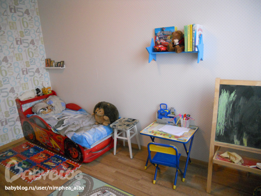 сейчас уже немного по-другому. Шкаф переставили на то место, где на посл. фотке доска стоит. До сих пор не купили детский ночник, пока обычный стоит. И часы с Маквином еще не купили. Еще хочу организовать уголок для рисования и прочих дел, но стол легко двигается, потому качует не только по комнате, но и по всей квартире. Хотели купить другой стол, но вроде как есть, этот куда.. еще есть над чем рабатать короче.