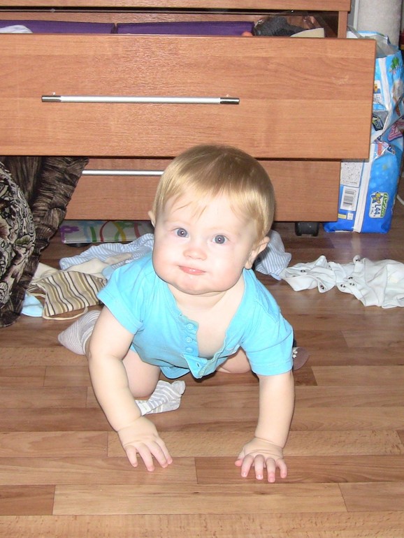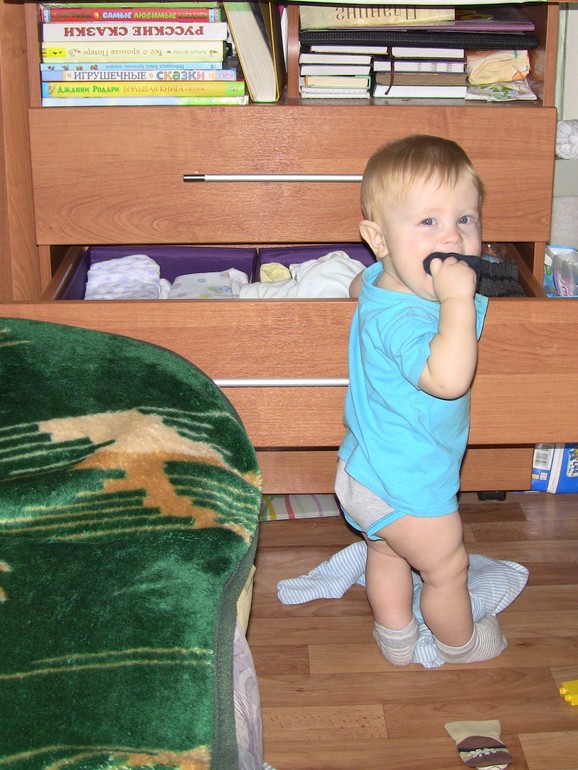 Это маленькое дитятко носится целыми днями по квартире. Иногда он совершенно ручной - последние два или три дня не слезает с меня вообще, стоило мне сегодня выйти из дома - кинулся меня искать по всем комнатам. В другие же моменты он может очень долго сам себя занимать - например, детальками лего. В фаворе среди них - лиана и тарелка с сосисками. Но если вы хотите занять ребенка на полчаса или даже больше - дайте ему пару коробок с его одеждой. Еще лучше - целый комод. Здравствуй, освободившееся время!