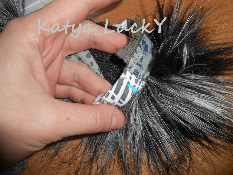 Для крепления на кап (вторая часть молнии) я так же не морочусь. При пошиве капа поверх пришиваю молнию, сверху закрываю планкой в 2 сложения. Как на принтованных, так и на однотонных тканях выглядит хорошо как с опушкой, так и без опушки.