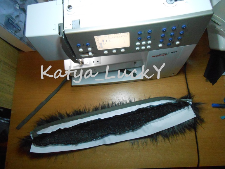 3. Складываем пополам опушку мехом внутрь, вторую планочку загибаем под припуск на молнию и стачиваем мех и планочку с торцов. мех заправляем внутрь, чтобы красиво лежал в опушке