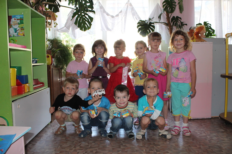 Ну а ещё сегодня мы ходили в садик к Ксюшиным друзьям, они спели Ксюше каравай-каравай, подарили подарочек, а Ксюша им подарила сладкие презенты (Барни и сок)