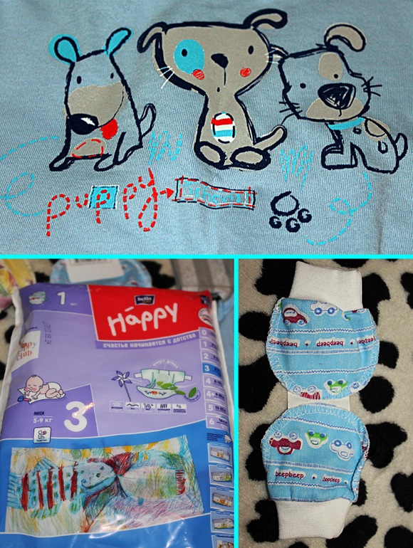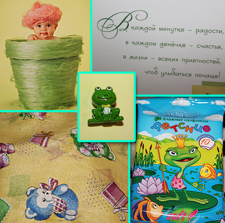 очень красивая пелёночка с милыми мишками; голубенькие рукавички для будущего малышастика; супер-пупер волшебный бодик, от которого я вообще пищала от удовольствия; детские влажные салфетки с обворожительной лягушенцией и рыбками (у нас я таких не видела); красивая открытка с замечательными пожеланиями и посланием от Анастасии; магнитик лягушонок, который обязательно заманит аиста в наш дом и первый памперс для нашей будущей ляли.
