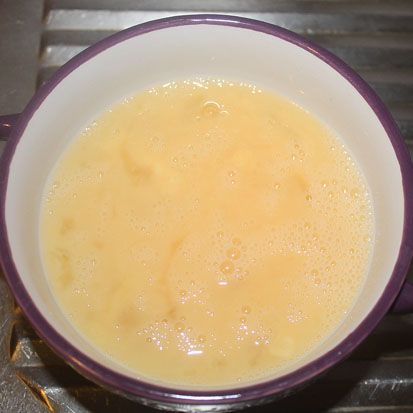 6. Включить мультиварку в режиме "Жарка", налить небольшое количество растительного масла и влить половину яичной массы. Яйца немного схватятся (выключить мультиварку, а то пережарите) и сразу выложить ломтики картофеля на полученный омлет, следующий слой - ветчина, посыпать зелёным луком, потом тёртым сыром и полить оставшимися яйцами.