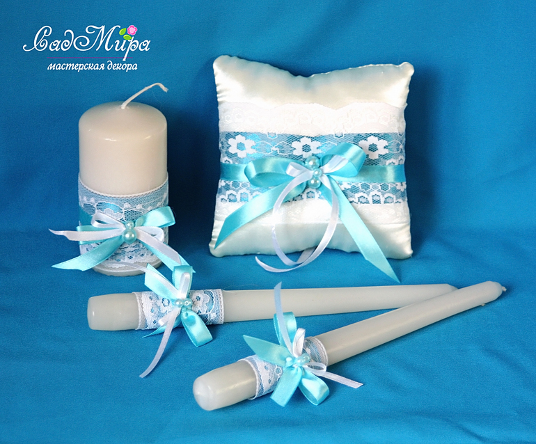Подушечка для колец и свечи домашний очаг в голубом цвете.