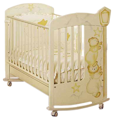 -снабжена четырьмя проворачивающимися резиновыми колесами и двумя тормозами, которые позволяют передвигать и блокировать кроватку в полной безопасности.