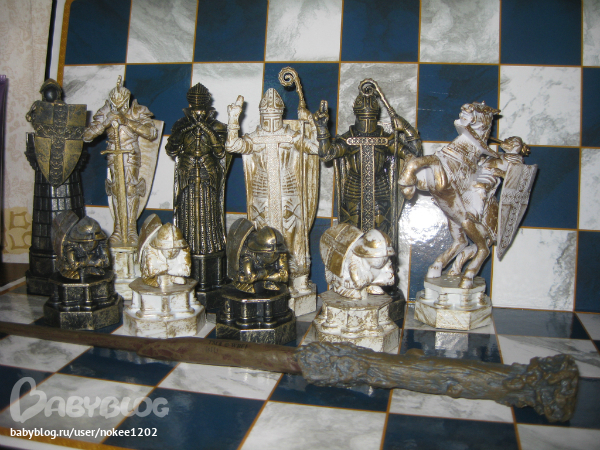 Шахматы ГП: Черная Ладья, Белый король, Черный Ферзь, Черный и Белый Слоны, Белый Конь (эти фигуры все с эффектами: подсветка, звук, магнит), 4 пешки (разрушаются), магнитная волшебная палочка, шахматная доска и одна часть рамки шахматной доски (нет на фото).
