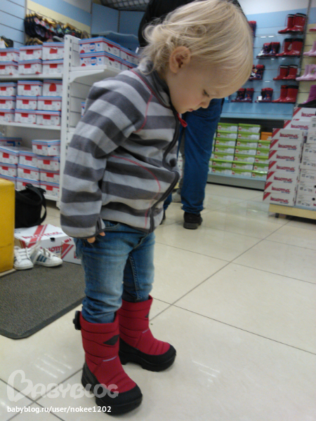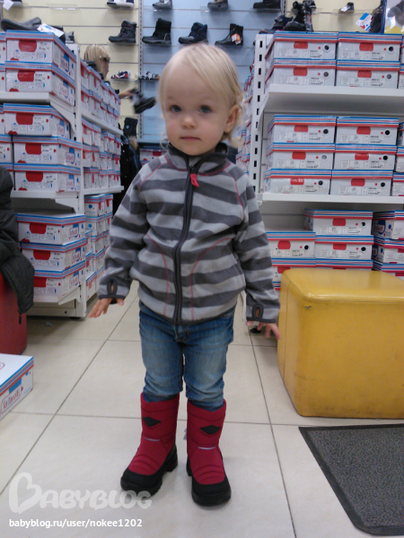 Вот странно так. Одели 23й размер, сидят хорошо, пальцев впритык я не нащупываю (я вообще не смогла их прощупать через сапог, если честно))). Одели 24й р-р, вроде бы тоже неплохо. Но 24й смотрятся много больше, чем 23й... Жаль в 23 р-ре не сфоткала, а в 24м, смотрите, кажется, что они ей явно велики..