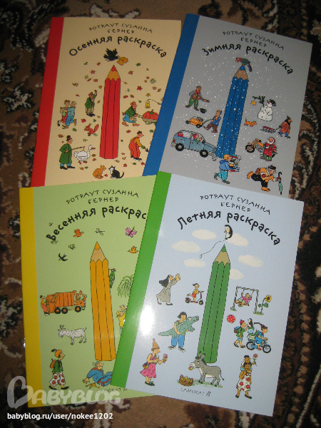 У нас уже давно есть Весенняя и Летняя, а Зиму и Осень никак не могла дождаться, чтобы обе были одновременно)) Лиза любит разглядывать, называет, кого узнает. Иногда я прошу ее что-нибудь поискать. Думаю, чем старше будет становиться, тем интереснее будут для нее эти книги.