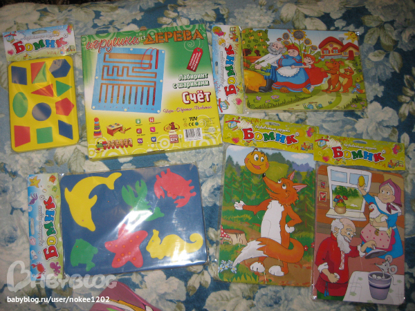 Лабиринт, пирамидка и пазлы очень классные!!! Пазлы очень крупные из 6 элементов. Как раз то, что сейчас надо. Жаль, что лабиринт на самом деле не деревянный, как заявлено, а из ДВП (что, в принципе, было ожидаемо, т.к. есть игрушки этой марки у нас).
