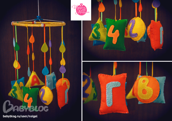 Многие современные методики рекомендуют начинать обучение малыша прямо с пеленок. Эти методики предполагают размещение в кроватке и по квартире карточек с буквами, цифрами, фигурами и пр. Благодаря мобилю "АБВГ" ваш кроха познакомится с первыми буквами алфавита, с первыми цифрами и основными фигурами, конечно с помощью мамы).