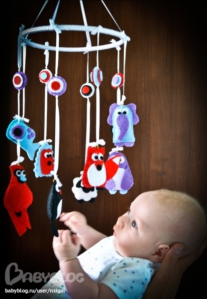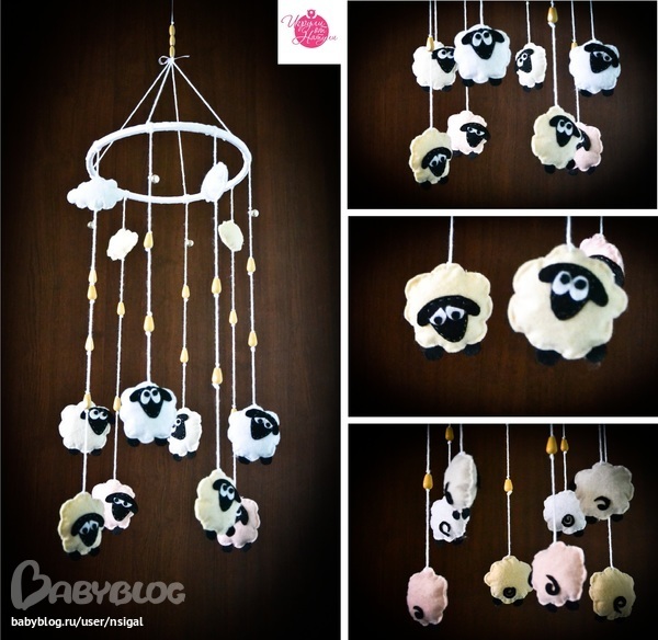 Я молодая мама из Перми. Во время ожидания моего сыночка я увлеклась изготовлением мягких игрушек, вязаных, шитых... Все они успешно раздаривались друзьям и родственникам. Меня стали просить шить или вязать игрушки на заказ, уж больно они всем понравились) В общем на данный момент я остановилась на самом любимом моем виде игрушек - мобили в детскую кроватку. Ведь мобиль - это самая первая игрушка крохи. Большую часть времени новорожденный малыш лежит в кроватке и изучает окружающий его мир. Я создаю мобили с учетом того, чтобы ребенок получал первую зрительную информацию о цвете, форме, животных, буквах, цифрах... Есть мобили, которые носят успокаивающую и засыпательную функцию, например мобиль "Овечки") Во все мобили вложена частичка моей души, моего мира, полного нежности и любви)) Представляю Вашему вниманию самый первый экземпляр.