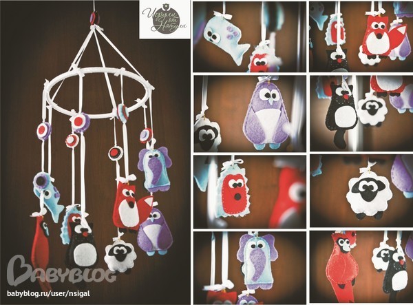 Все свои игрушки на данный момент я делаю из фетра, для меня это самый приятный материал в работе. У него множество различных цветов. Сначала все игрушки тщательно продумываются, набираются идеи, где-то что-то подсмотрю, иногда заказчики определенный вид мобиля закажут, иногда идея даже приснится или придет в голову во время медитации (открыла ее для себя совсем недавно!!!) Затем игрушки шьются, набиваются холофайбером и устанавливаются на конструкцию, подготовленную заранее.