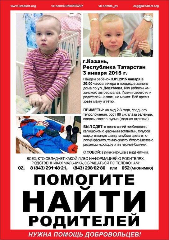 Неделю назад, 3 января 2015 года, в Казани в подъезде дома, который находится недалеко от автовокзала был найден маленький мальчик. На вид малышу 2-3 года. Его рост - 89 сантиметров, вес - 15,2 килограмм. Своего имени он не называет.