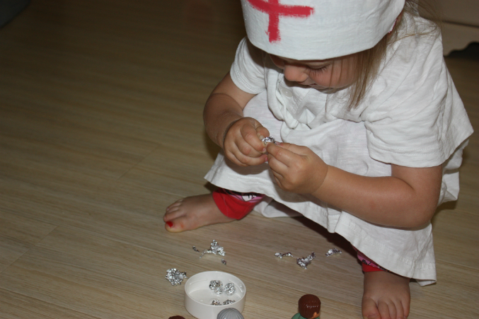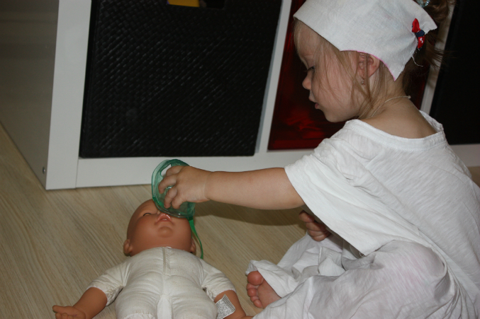 После завтрака спросила Настю хочет ли она быть доктором и всех куколок лечить? Да.- ну этого я и ждала)) собственно наряд и аксессуары уже приготовлены. Папина футболка вместо халата и сделанный за 5 мин колпак)