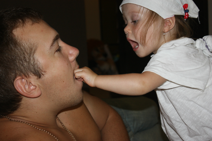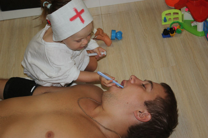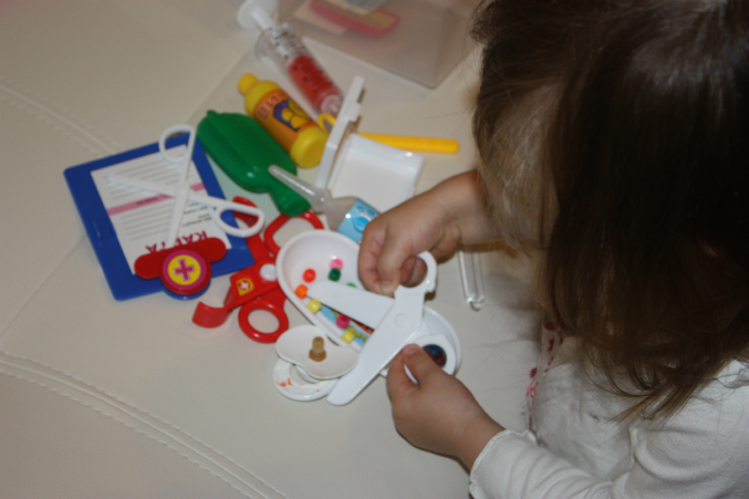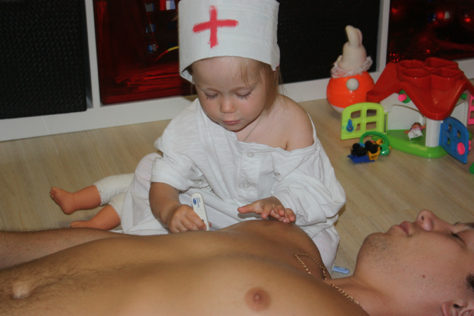 И вот мой маленький врач. Первый Настин пациент - папа, его и лечили. Достаем нужное из сумочки (сначало такая, после обеда купили настоящий набор доктора)