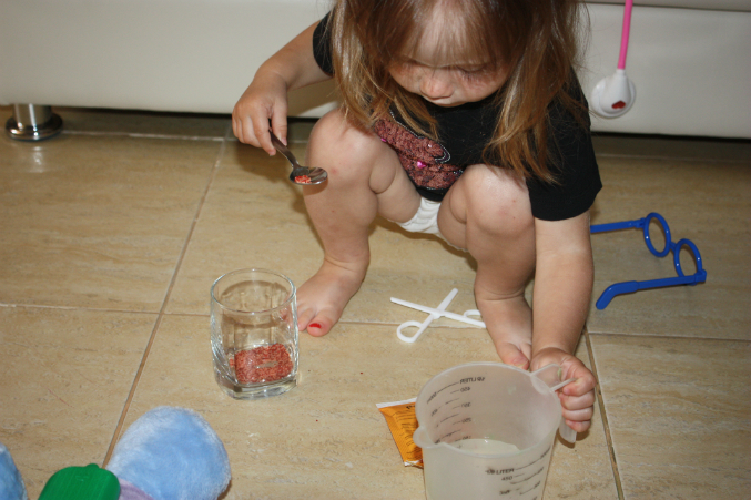 Делаем микстуру. Пищевой краситель, вода и чашка с ложкой. Учимся правильно держать ложку, мешать ею в чашке совершая круговые движения. Движения еще резкие. Можно растворять сахар, соль, но для наглядности я взяла краситель.