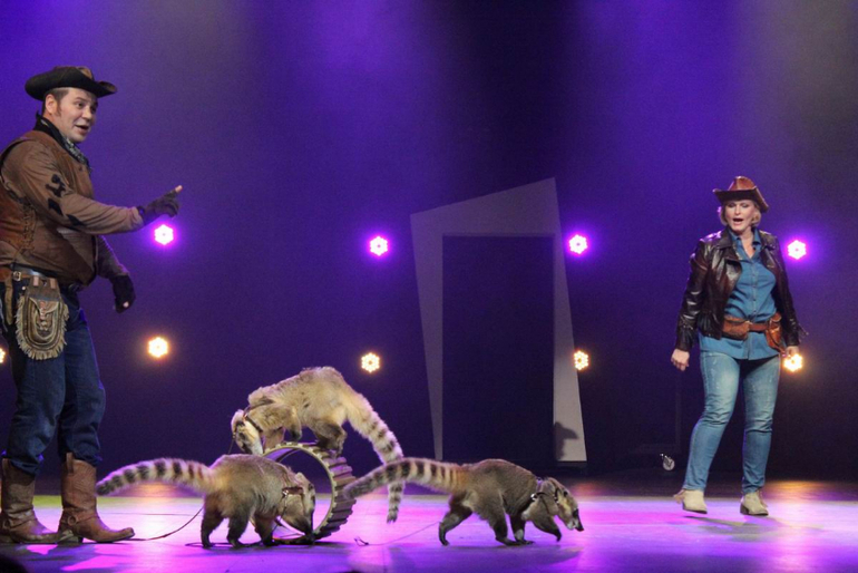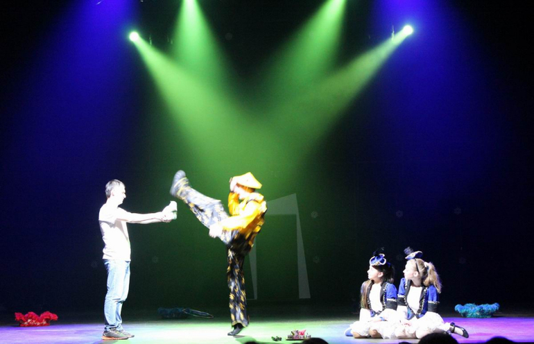 За который по большей части отвечает... хм, где-нибудь в другом шоу его бы могли назвать клоуном, но здесь этой достойнейшее звание лишь принизило бы тот спектр функций, что успевает выполнить Адам Талин, начав за час до представления развлекать малышей в фойе играми, тренировками мимов, ездой на мотоцикле и много чем ещё.