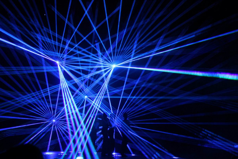 Лучи лазеров, пронзающие зал яркими узорами, для сетчатки глаз безопасны, а контраст игры света позволяет незаметно заполнить сцену новыми декорациями.