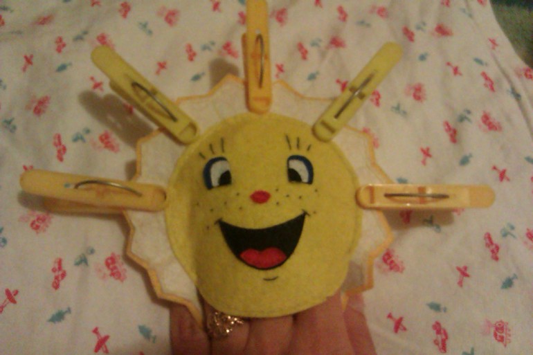 Солнышко и павлинчик из фетра. Идея взята здесь. Одеваются на детскую ручку, а дальше цепляются прищепки. Ручка вставляется не на всю игрушку, что не дает ушипнуться прищепкой. И пара фото.
