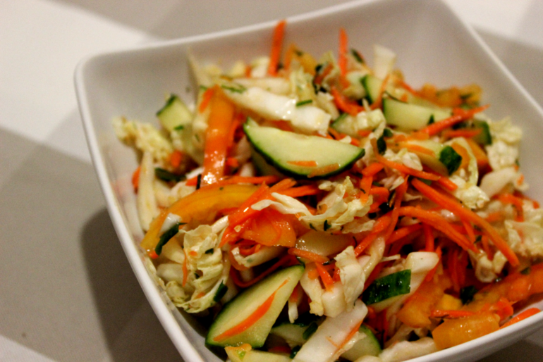 Заправка: сахар (1 ст.л.), соевый соус (3 ст.л.), уксус (1 ст.л.) и кунжутное масло (1 ч.л.), хорошо перемешайте.