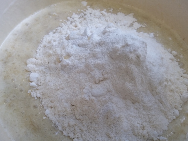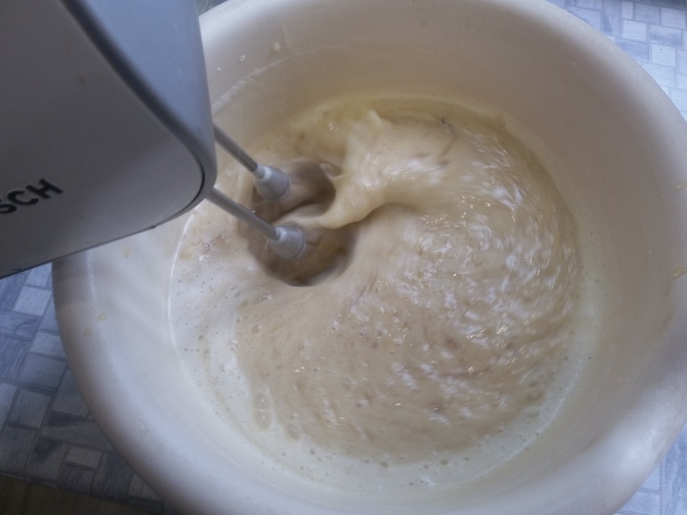 Добавить 1 ч.л. разпыхлителя и муку (тесто должно быть консистенции густой сметаны):