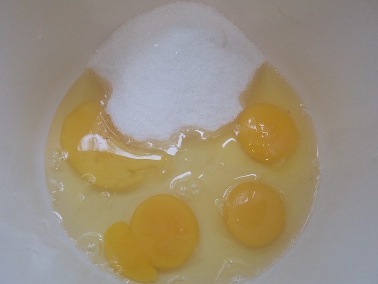 В чашу миксера положить 4 яйца с 0,5 стакана сахара: