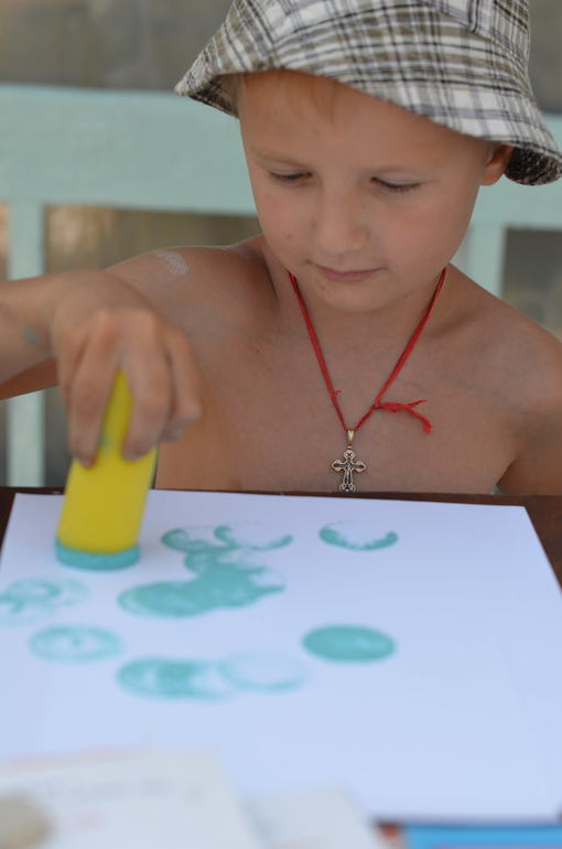 мы пробовали штампы делать из кукурузы и картошки. Интересно получилось!