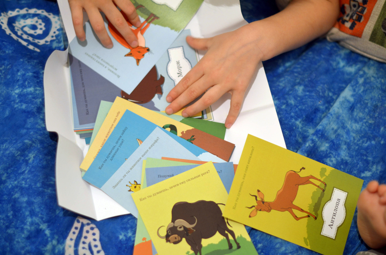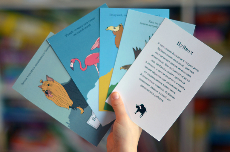 А еще наши карточки развивают интерес и желание к самообразованию. На лицевой стороне каждой открытки есть вопрос, который способствует развитию фантазии, воображения, эрудиции и находчивости. Некоторые ответы можно получить, проведя небольшое исследование.