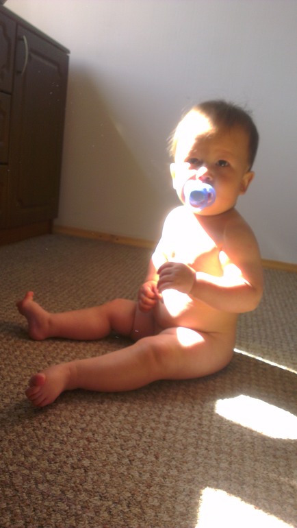 По дому носился - не угнаться. Конечно, я утрирую - быстро на животе не уползешь, но по другому Паша так и не научился ползать)) зато научился садится (наконец-то!) задом))) все не как у людей!) из положения на животе встает на коленки и пятится. Потом плюхается попой на пол. Сначала не очень получалась, да и не всегда можно определить, где именно он в конце концов приземлится, но да ладно)) Периодически клевал носом об пол, сейчас уже меньше)