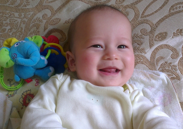 А зубов-то, зубов то уже 5! Ну ладно, не так много) внизу - два, наверху - три и еще один на подходе. Опять таки не заметила явных признаков волнений из-за зубов.