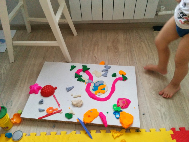 Играем на полу, чтобы не грохнуться с дивана :) Причем, самое эффективное время сашино-алисиных игр - это время дневного сна. Тихие игры возможны только в это время. Режим? Важен, но не сейчас. Лучше будем заниматься творчеством :) Лепили волшебный лес, без хронологии никак :)