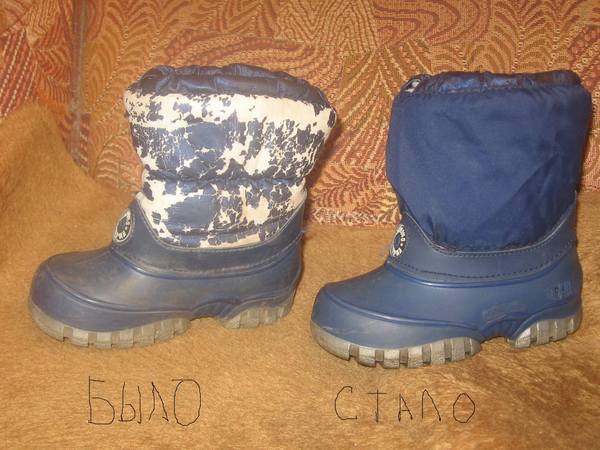 Подарила мне здешняя подруга такие сапожки. Сапожки отличные - не промокают, теплые..) На даче дочь их таскала отлично! Но...для Москвы уж очень они потрепанные - штанина поднимется и некрасиво(((( И решила я их реанимировать, чтоб в Москве прилично выглядели и потом еще детишки смогли их поносить )))