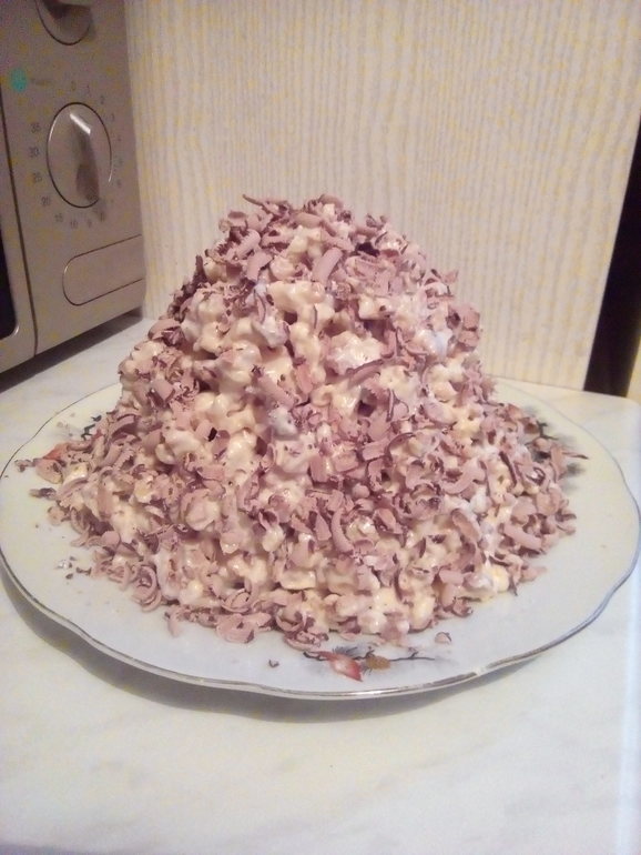 То, что испеклось поломать на мелкие кусочки и перемешать с кремом. Выложить на блюдо в виде муравейника. Украсить можно тертым шоколадом. Я еще один раз делала порционно - выкладывала маленькие "муравейнички" в формы для капкейков - тоже неплохо смотрелось и было удобно есть гостям.