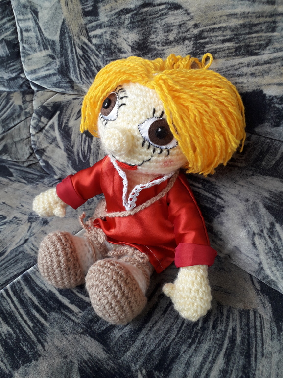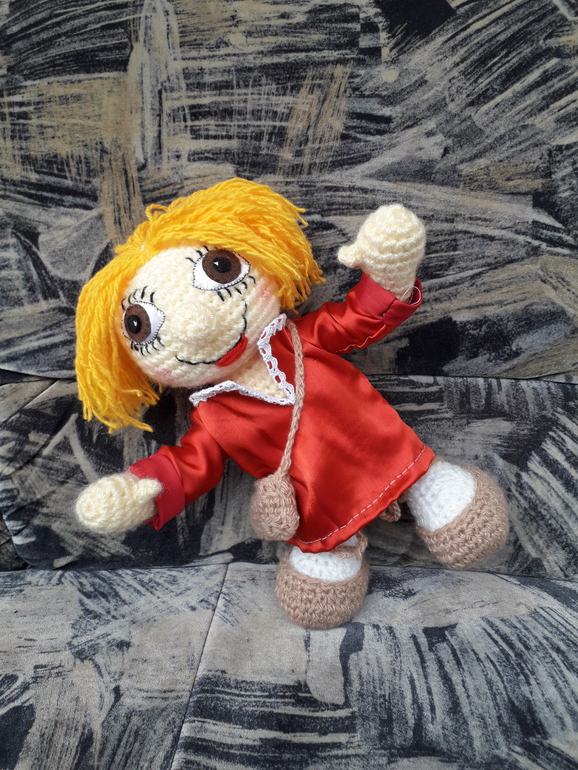 Вязала "из головы", пряжа акрил, проволочный каркас. Лапти снимаются, рубашка сшита на руках и я вааще не швея)