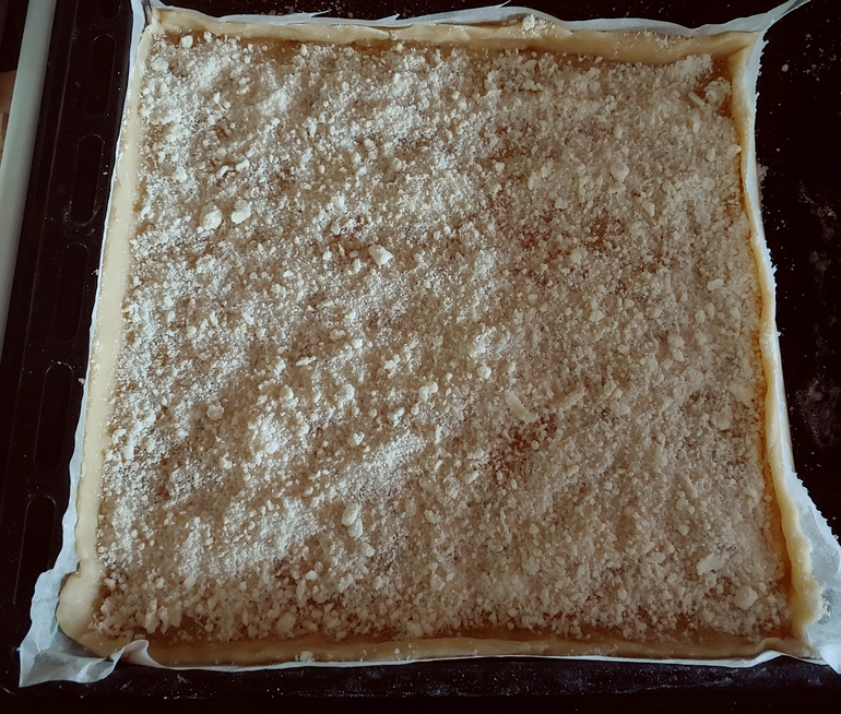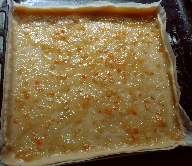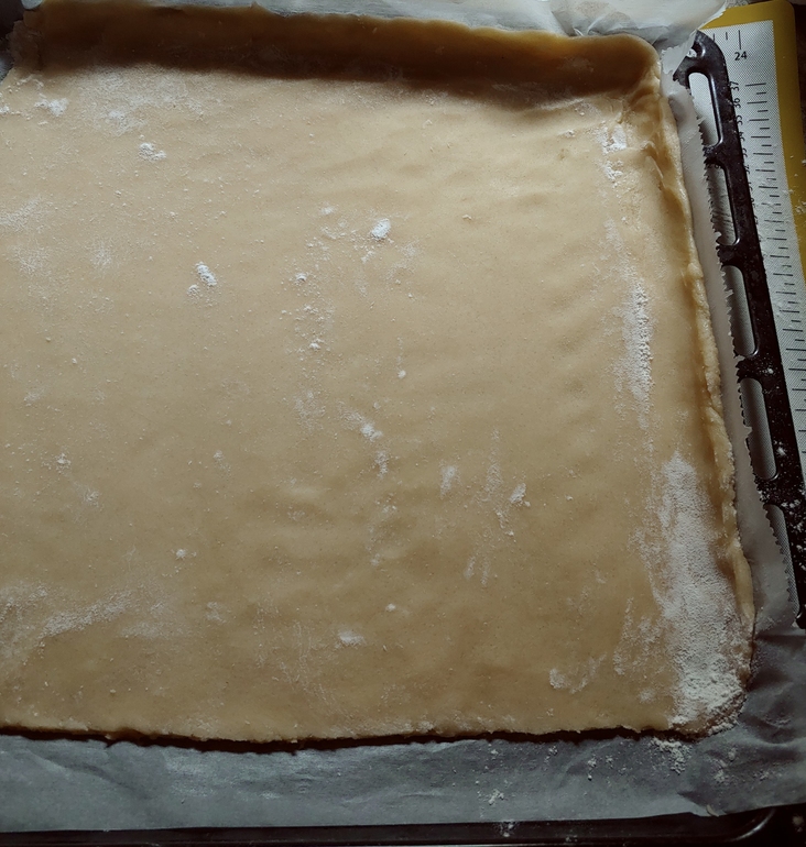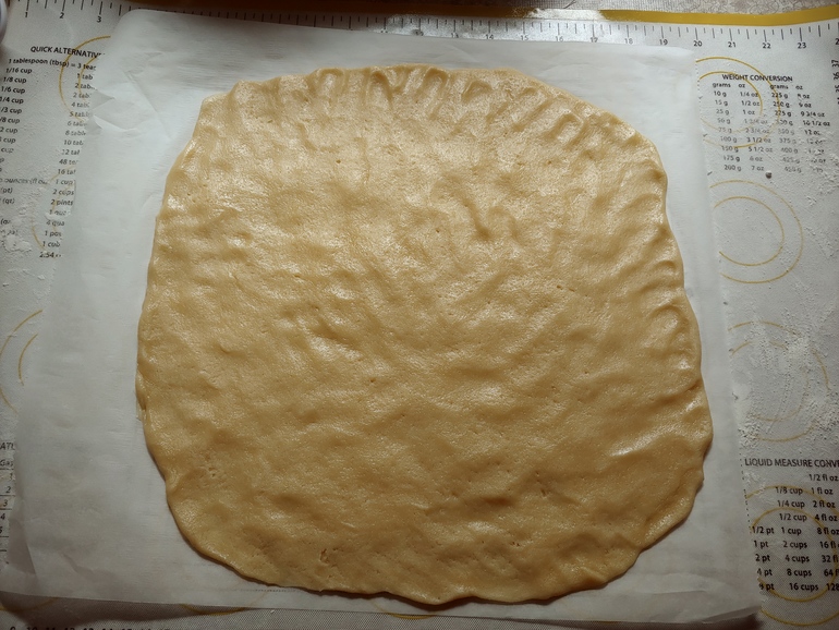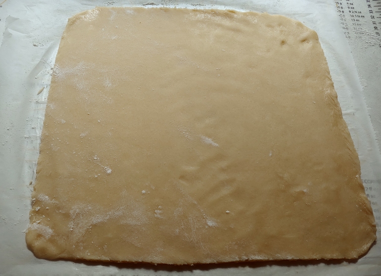 Раскатывать лучше сразу на бумаге для выпечки (легче потом переложить на форму).