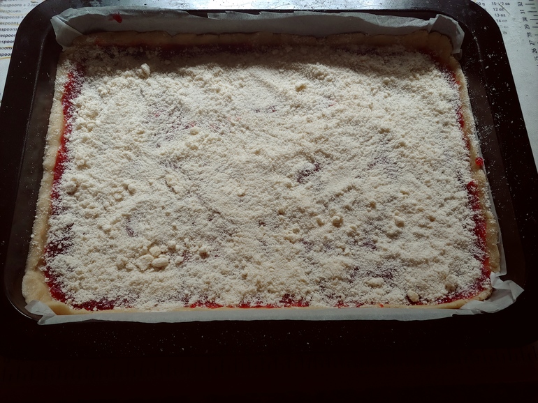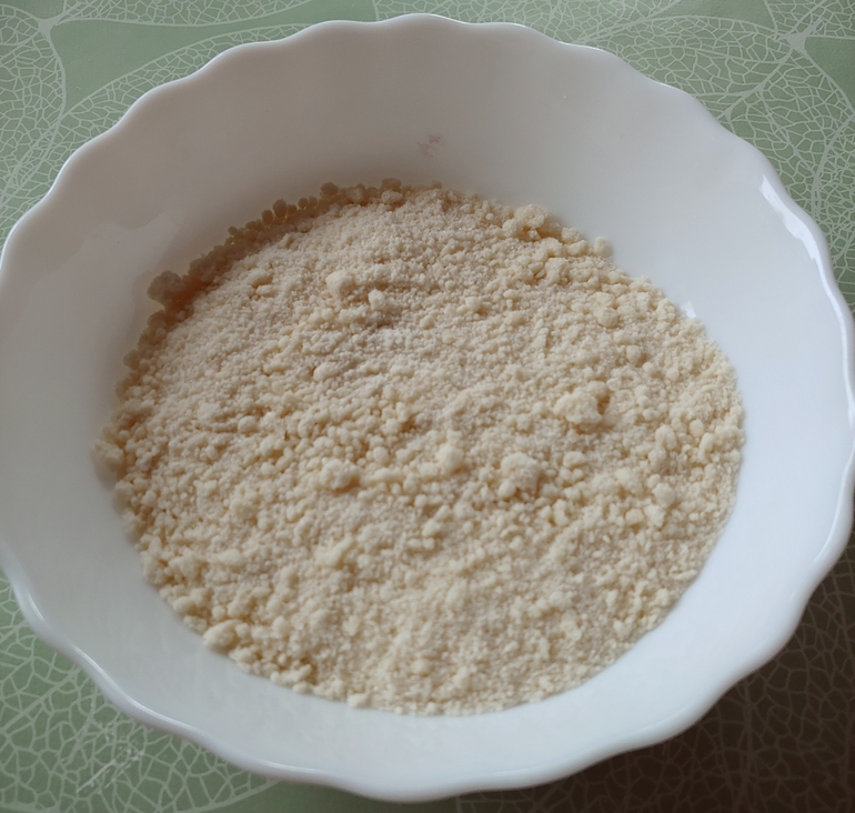 ◼ Холодное масло перетереть с мукой, разрыхлителем и сахаром.
