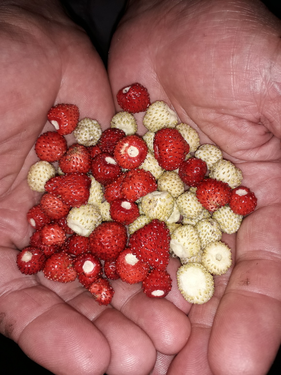 Вот она! Первая земляничка созрела, там уже розовых полно, ура! Это моя гордость - выращенная мною из семян, 4 сорта - 2 красные и 2 белые. Безусая, ремонтантная - едим до морозов.